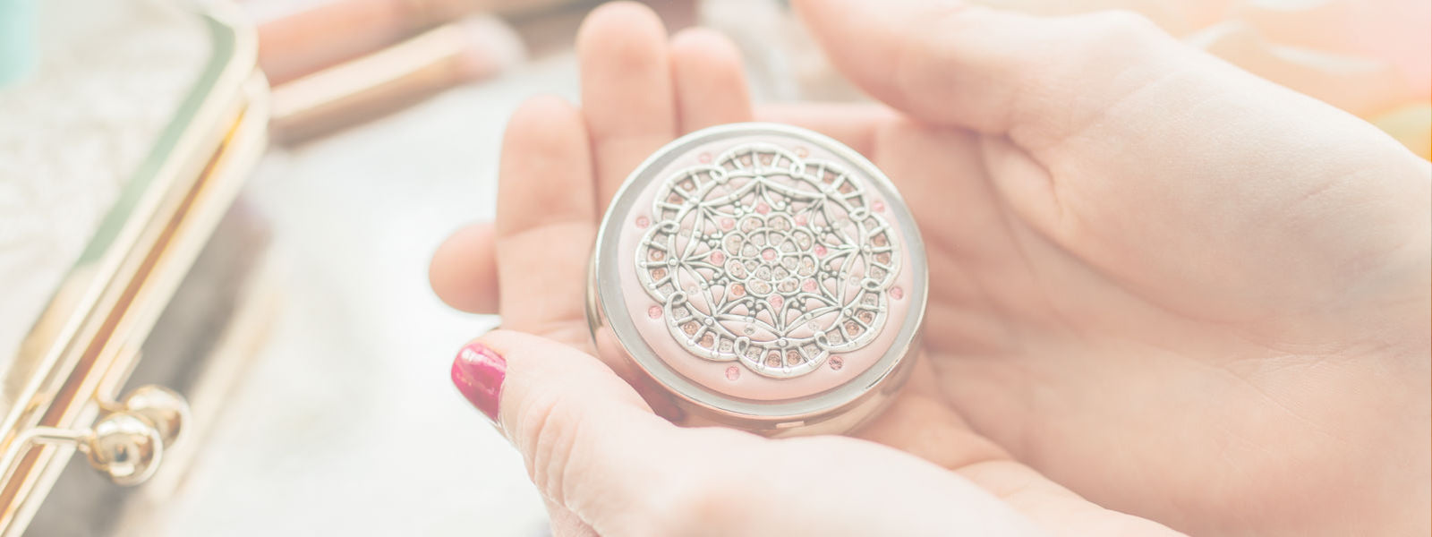 Description: This beautiful handmade compact features two regular mirrors inside. The top is embellished with...